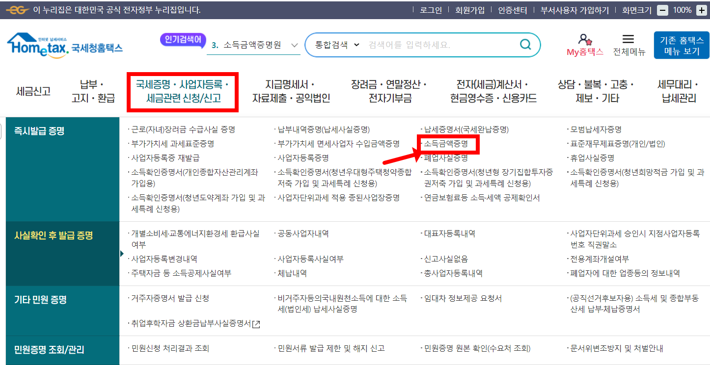 국세청 홈택스 홈페이지에서 로그인을 한 후 아래 빨간 네모박스의 소득금액증명을 클릭합니다.