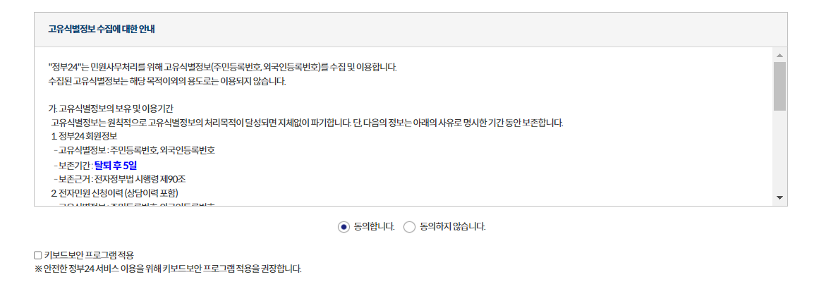 개인정보 수집에 관한 이용 동의에 동의와 키보드보안 프로그램 적용을 클릭합니다.