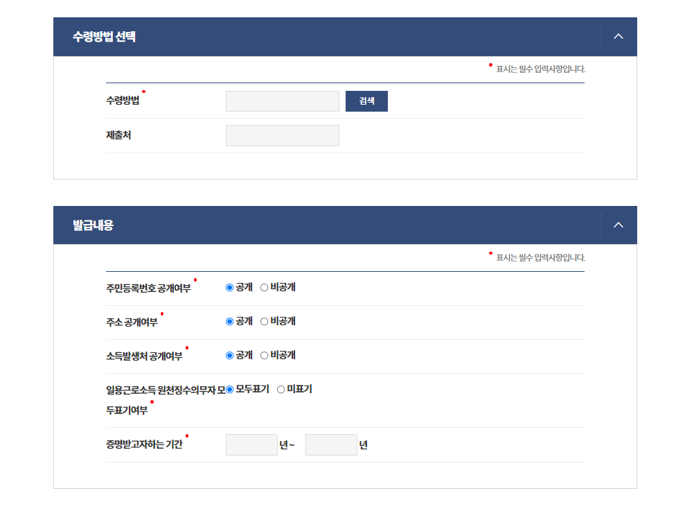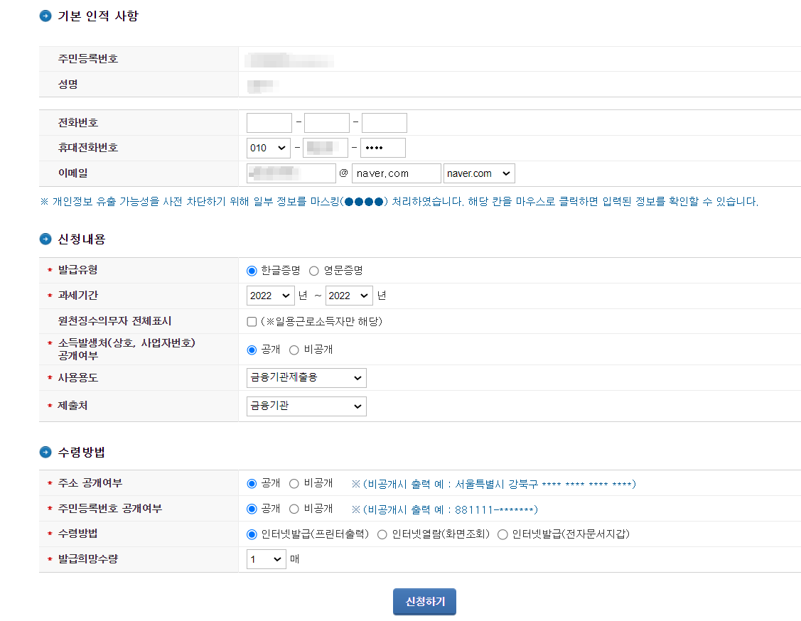 발급내용란의 주민등록번호, 주소등의 공개 여부는 제출처에 따라 달라질 수 있으나 주로 금융기관이나 관공서에 제출하는 경우 모두 공개로 하여야 합니다.
