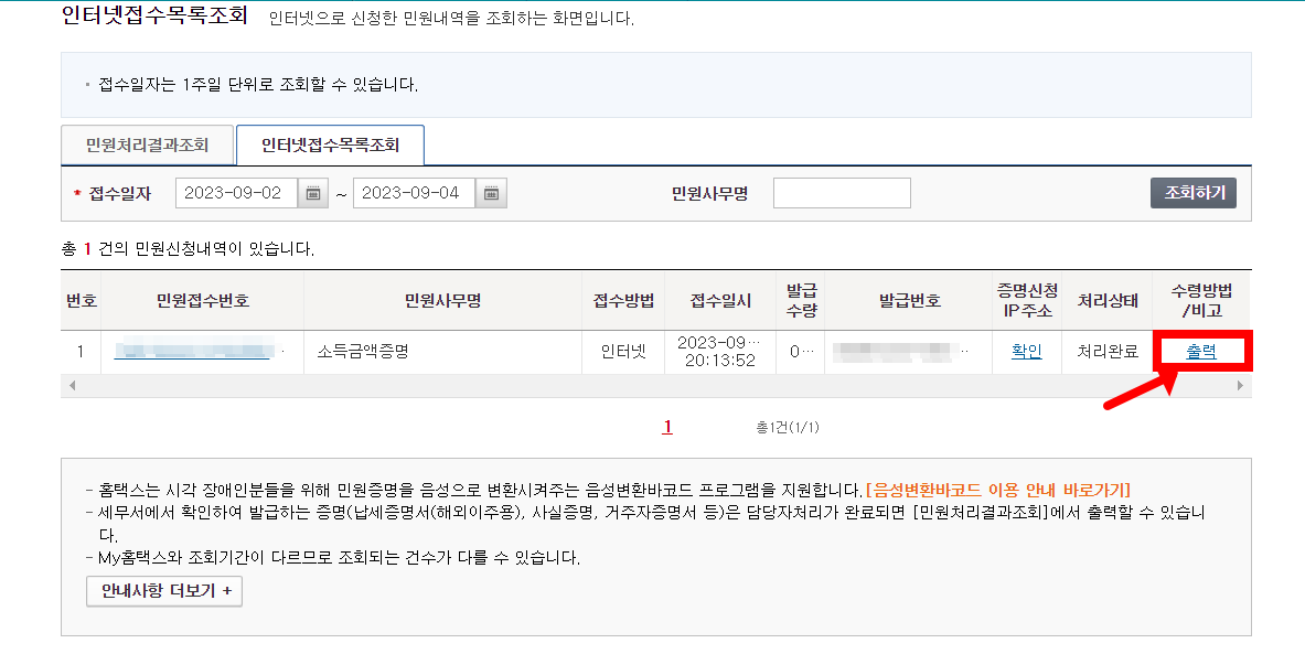 신청이 완료되면 인터넷접수목록조회를 통해 소득금액증명의 접수번호 및 출력 버튼이 생성됩니다.