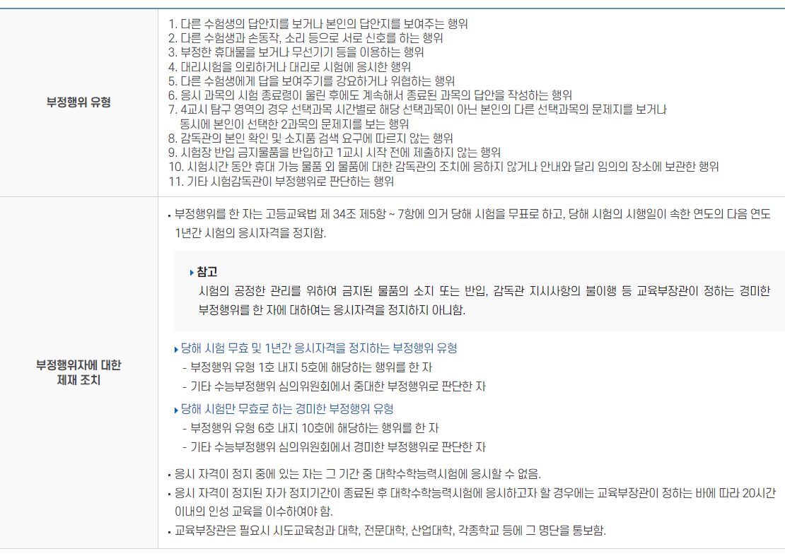 부정행위를 한 자는 당해 시험을 무표로 하고, 당해 시험의 시행일이 속한 연도의 다음 연도 1년간 시험의 응시자격을 정지하며 정지기간의 종료 후 대학능력시험에 응시하고자 할 경우에는 교육부 장관이 정하는 바에 따라 20시간 이내의 인성교육을 이수하여야 합니다.