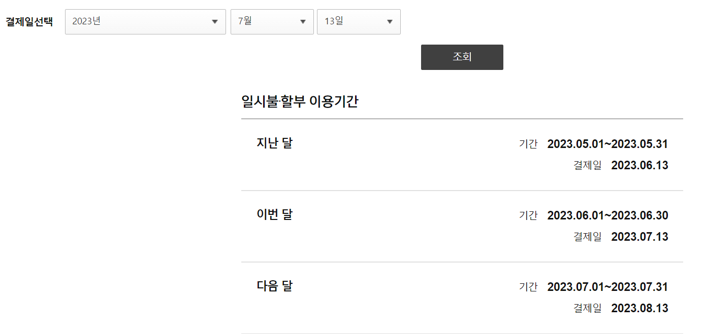 결제일이 13일인 경우 카드 이용기간은 전월 1일부터 전월의 말일까지로 설정되어 있습니다.