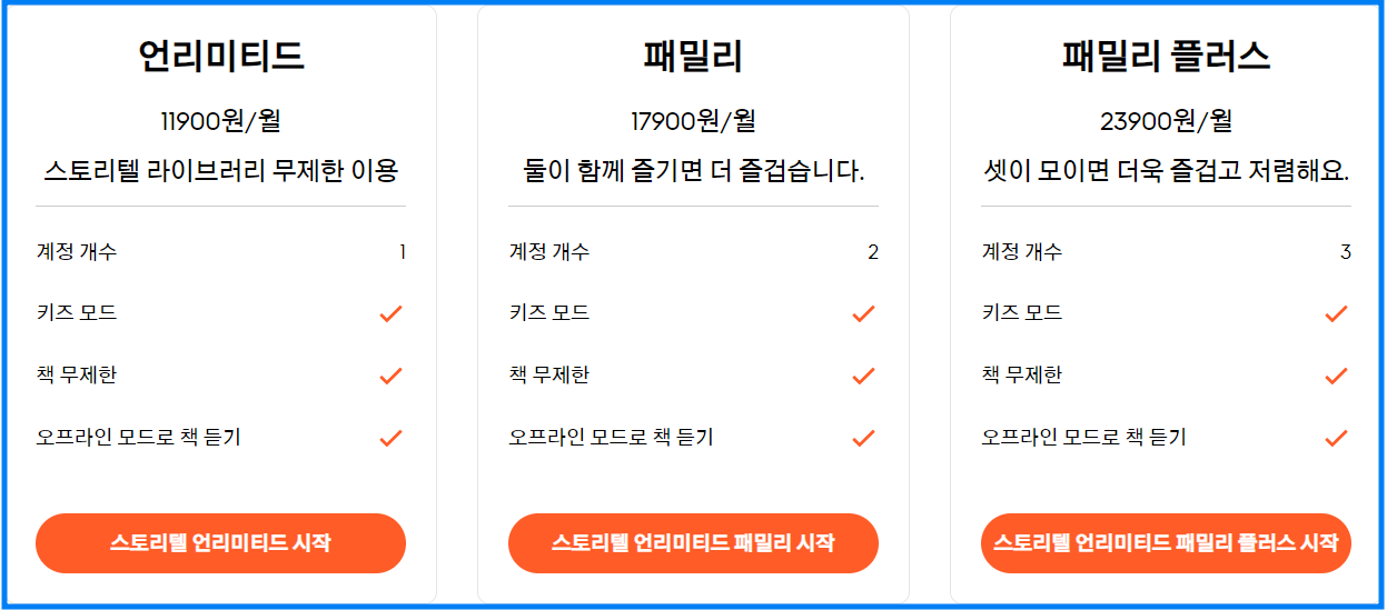 스토리텔 요금제는 계정 개수를 구분하여 언리미티드, 패밀리, 패밀리 플러스 요금제가 있으며 상세 내용은 아래와 같습니다.