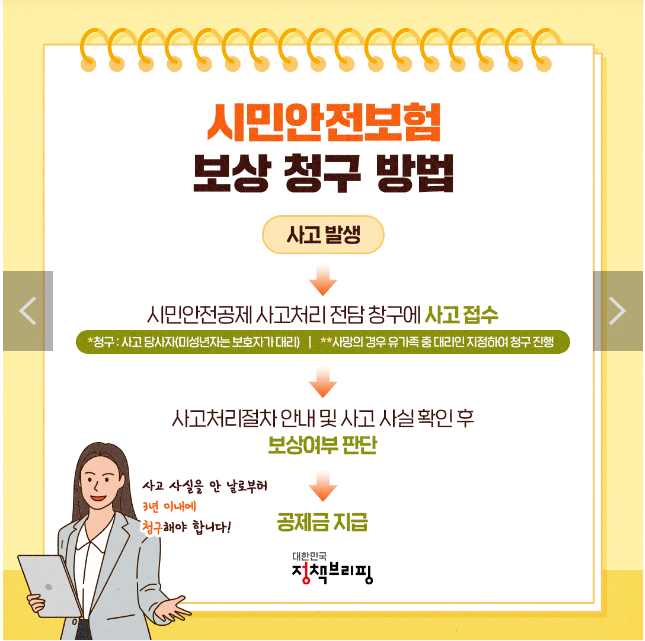 시민의 안전사고로 인한 보상금의 청구방법은 사고사실을 안 날로부터 3년 이내에 청구가 가능하며 각 지자체의 시민안전공제 사고처리 전담창구에 사고접수를 하여야 합니다.