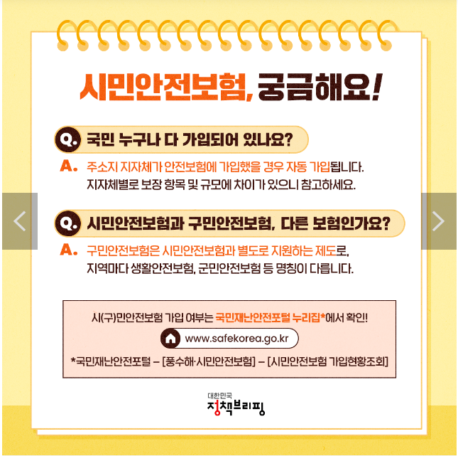시민안전보험은 주소지 지자체에서 가입했을 경우 별도의 신청 없이 국민 누구나 자동 가입이 되며 지역 별 명칭은 생활안전보험, 구민안전보험 등으로 다를 수 있으며 정확한 가입여부는 국민재난안전포털 누리집에서 확인할 수 있습니다.