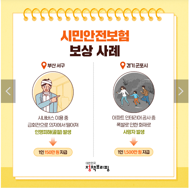 시내버스 이용 중 급회전으로 인한 골절 등의 인명피해 또는 아파트 공사 중 폭발로 인해 발생한 화재 등으로 사망자의 발생 시 시민안전보험을 통한 보상이 가능합니다.
