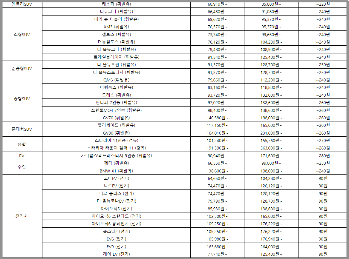 쏘카의 차종 별 일일대여요금 및 주행거리 1km당 요금은 아래와 같습니다.