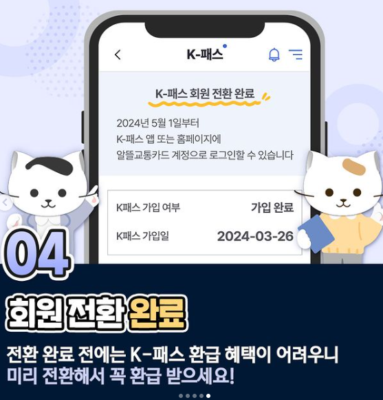 ④ K 패스 전환이 완료되면 환급 혜택을 받을 수 있으며 5월 1일부터 알뜰교통카드 계정으로도 로그인이 가능합니다.