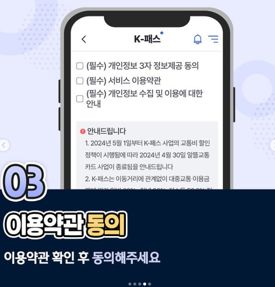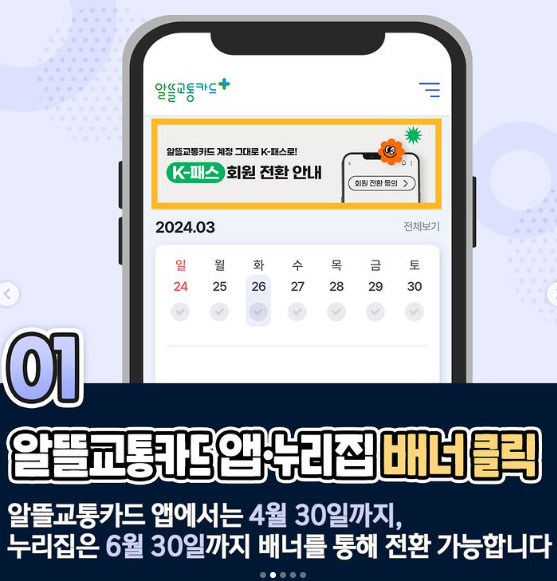 기존의 알뜰교통카드를 사용 중인 분들은 5월 1일부터 시행하는 K패스의 회원 혜택을 받으시려면 반드시 회원전환을 하셔야 합니다.