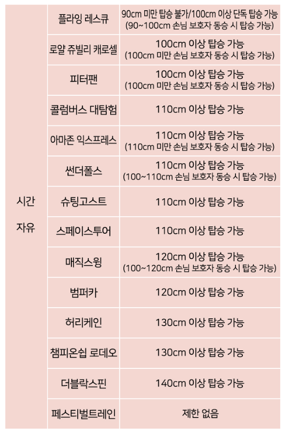 에버랜드 어트랙션 별 시간 선택 및 시간 자유 구분에 따른 제한사항은 다음과 같습니다.