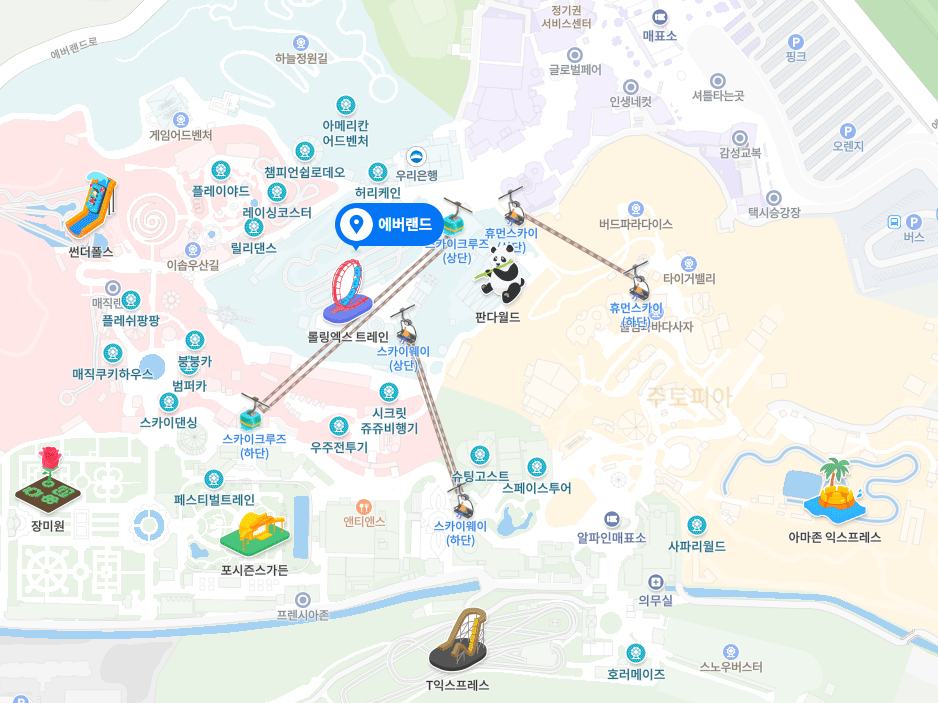 다음에서는 에버랜드의 놀이시설 별 제한사항과 각 놀이시설의 위치를 지도를 통해 자세히 알아보겠습니다.