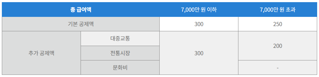 기본공제 한도액은 총소득금액이 7,000만 원 이하일 경우에는 300만 원, 7,000만 원 초과 시 250만 원을 공제받을 수 있으며 전체 신용, 체크카드 및 현금영수증의 발행액이 연봉의 25%를 넘지 않는다면 기본 공제액은 없습니다.