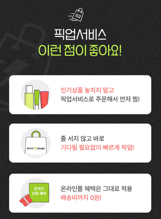 ② 올영 픽업서비스는 인기상품을 픽업서비스 주문과 줄 서지 않고 빠르게 픽업이 가능하며 온라인 혜택은 그대로 받을 수 있는 서비스입니다.