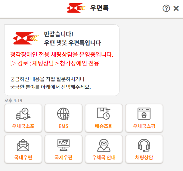 우편 톡은 카카오톡 챗봇을 이용한 우체국과 연결되는 톡으로 궁금한 내용을 질문할 수도 있고 아래 사진에서