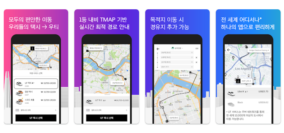 국내에서는 UT, 해외에서는 Uber가 배차되는 전 세계 어디서나 하나의 앱으로 편리한 글로벌 통합 호출 서비스를 제공합니다.