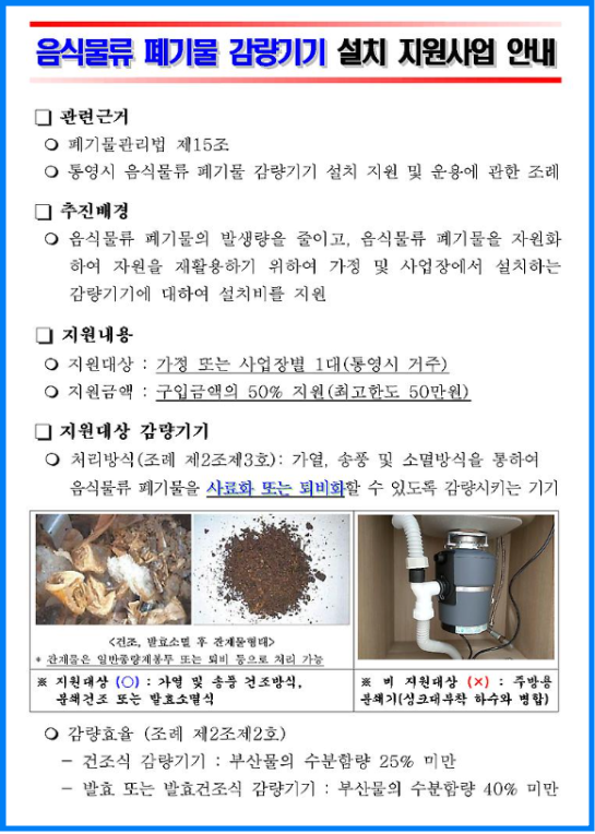 ③ 지원 대상 조건에 맞는 감량기를 직접 선택하여 구매하여야 하므로 구매 전 업체에 지원 대상 가능여부를 꼭 확인하셔야 합니다.