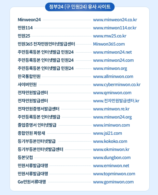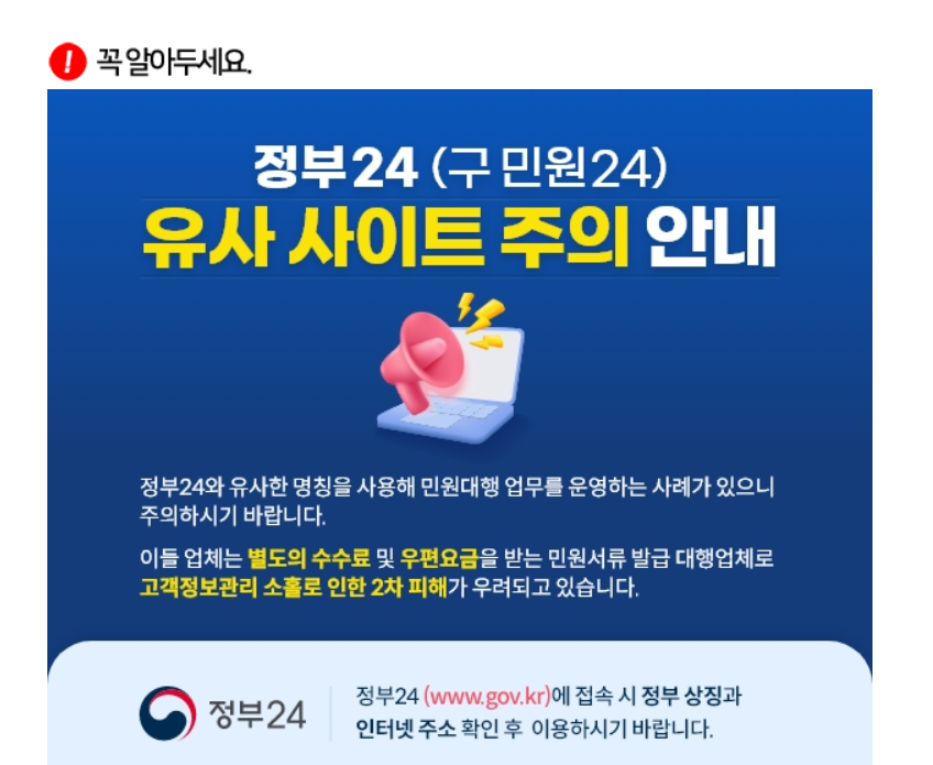정부 24를 사칭한 유사사이트가 많이 있습니다. 유사사이트 정보를 아래 사진으로 첨부하였으니 주의하시기 바랍니다.