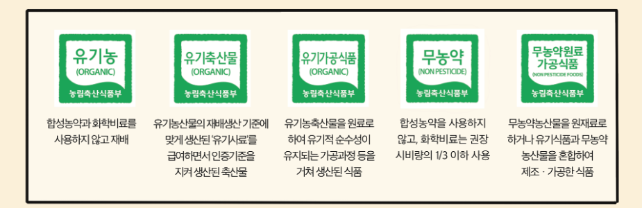 유기농, 유기축산물, 유기가공식품, 무농약, 무농약원료로 제조 가공한 가공식품으로 모든 제조 공정에 유기농만 사용됩니다.