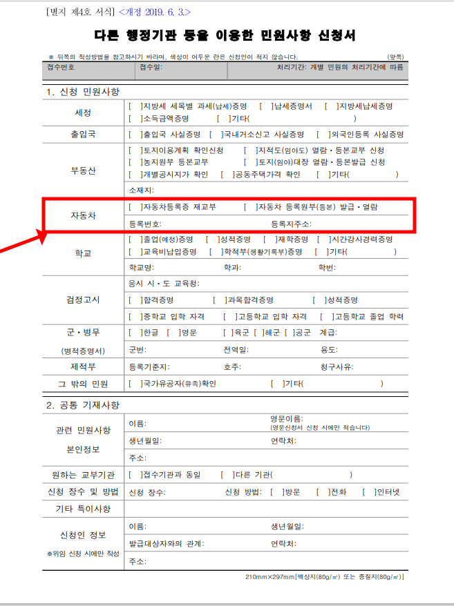 가까운 주민센터에서도 자동차등록증의 재발급이 가능하여 다른 행정기관 등을 이용한 민원사항 신청서의 아래 빨간 박스 안의 [자동차 등록증 재교부] 란에 체크하여 재발급 신청을 하시면 됩니다.