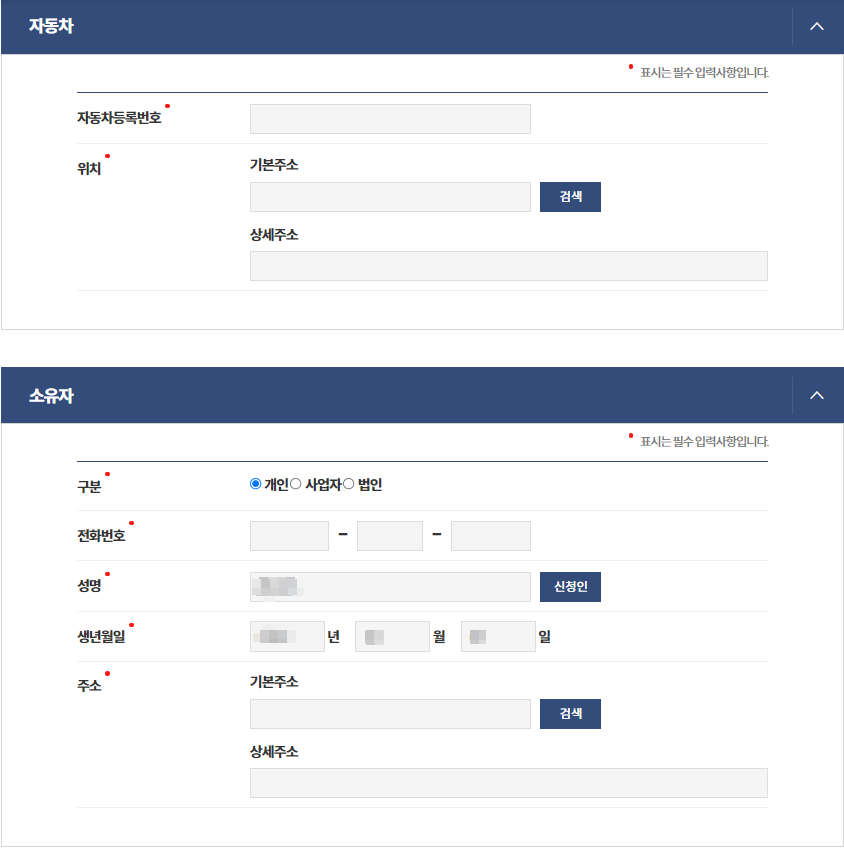 ④ 자동차등록증 재교부 신청서에 필수 사항을 입력합니다.