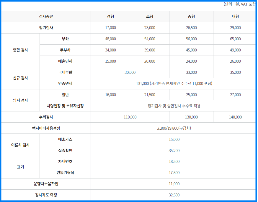 참고로 자동차의 종합검사를 받은 경우에는 「자동차관리법」 제43조의 2에 의거 정기검사, 정밀검사 및 특정경유 자동차검사를 받은 것으로 간주하며 세부적인 차종별 검사비용은 아래의 표에서 확인하시기 바랍니다.
