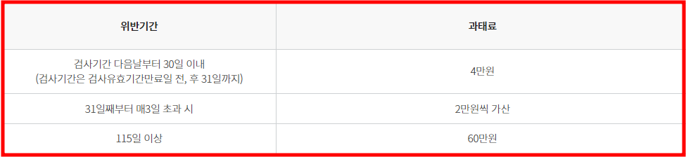 자동차 정기검사 및 종합검사를 검사유효기간 내에 받지 아니할 경우 60만원 이하의 과태료 처분을 받게되며 기타 세부적인 사항은 아래와 같습니다.