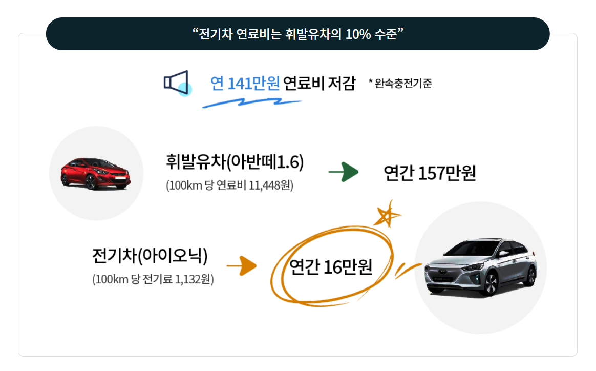 휘발유차의 연간 연료비 157만 원과 동급의 전기차 연료비를 비교해 보면 전기차 운행 시 연간 연료비 16만 원으로 개인용 완속충전기준 연 141만 원의 연료비 저감 효과를 가져옵니다.