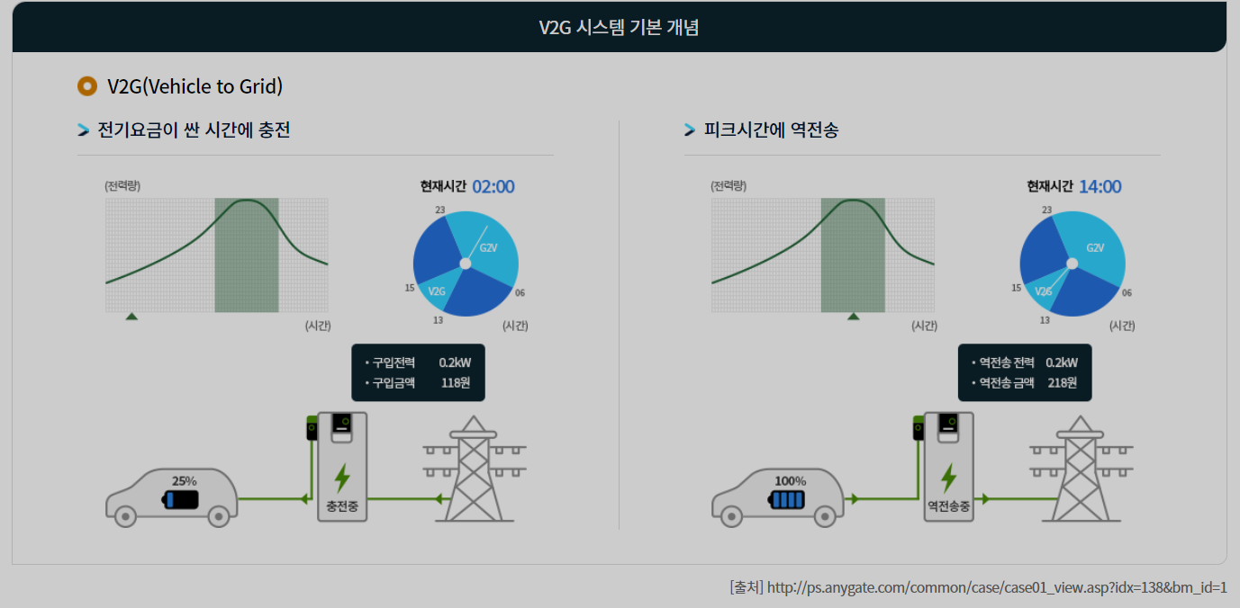 V2G(Vehicle To Grid)는 자동차에서 전력망으로 전기를 이동하는 것을 말하며 전기차에 저장한 배터리를 에너지저장장치(ESS)처럼 활용해 전력계통에 연계하는 기술입니다.