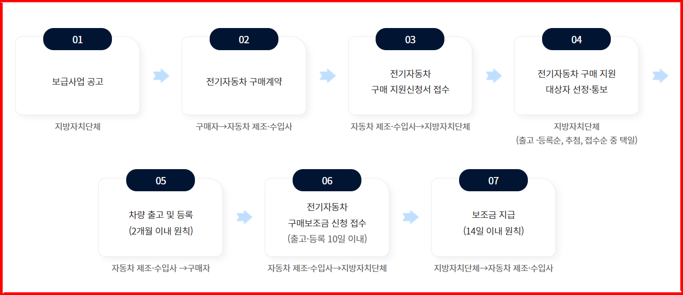 전기차의 보조금 신청 절차는 아래와 같으며 전기차 구매자는 차량 구매대금과 보조금의 차액을 자동차 제조사 또는 수입사에 납부하고, 자동차 판매사는 지방자치단체(국비보조금 +지방비보조금)로부터 보조금을 수령하는 방식입니다.