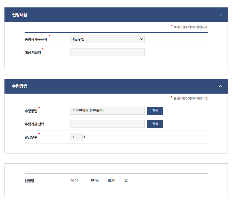 신청내용의 빨간 점이 표시된 증명서 사용목적과 대금 지급자 입력, 수령방법은 온라인발급으로 입력하시면됩니다.