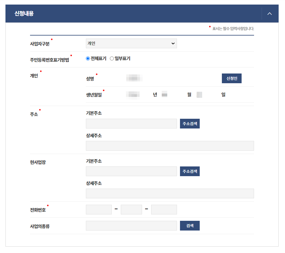 아래의 신청내용의 빨간 점이 있는 곳은 필수 입력사항으로 모두 채우셔야 신청이 됩니다.