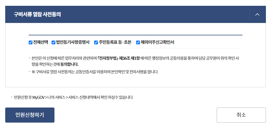 마지막으로 구비서류 열람 사전동의는 담당 공무원이 위의 확인 사항을 확인하는 것에 대한 동의이기 때문에 전체선택을 체크하신 후 민원 신청하기를 클릭하면 신청 절차가 끝납니다.