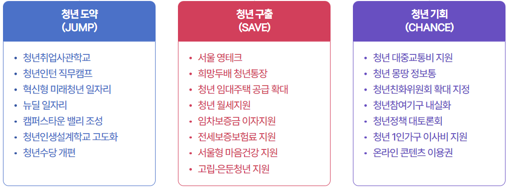 청년 몽땅 정보통은 2030 청년세대가 희망을 가지는 청년 서울을 만들겠다는 2025년 서울시의 종합 프로젝트로 청년도약(JUMP), 청년구출(SAVE), 청년기회(CHANCE)를 모토로 각 프로젝트 별 세부내용은 아래와 같습니다.