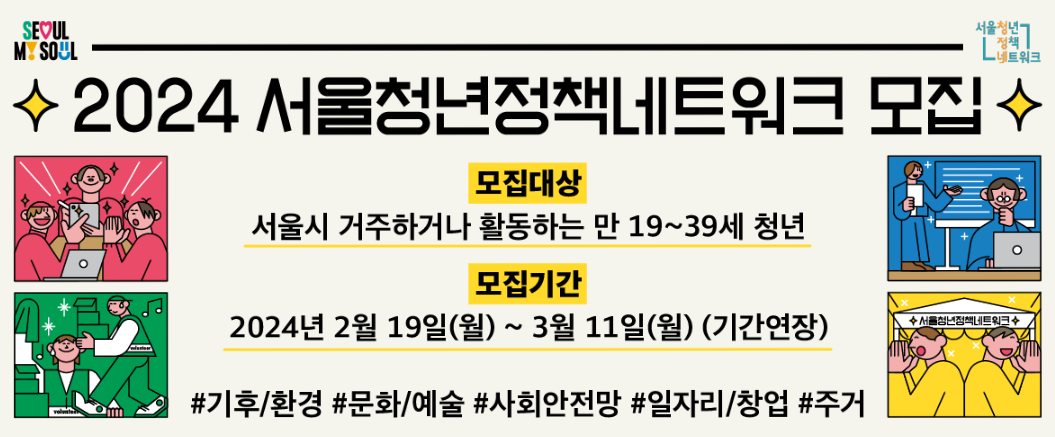 서울시 청년 몽땅 정보통에서는 서울광역청년센터를 개설하여 서울시에서 거주 또는 활동하는 만 19 ~ 39세 청년들을 대상으로 3월 11일(월)까지 2024 서울청년정책네트워크를 모집 중에 있습니다.