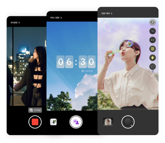 매주 새로운 업데이트로 필터, 타임스탬프, QR스캔, 연속촬영 등의 카메라 기능을 캐럿 앱을 통해 만나볼 수 있습니다.