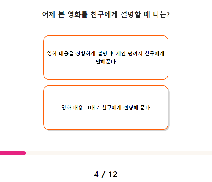 4번 문항은 저의 성격상 친구가 영화를 봐야 하는 상황이라면 스포는 금물이라고 생각하는데 위 문항에서는 딱히 고를 게 없다는 게 흠입니다.
