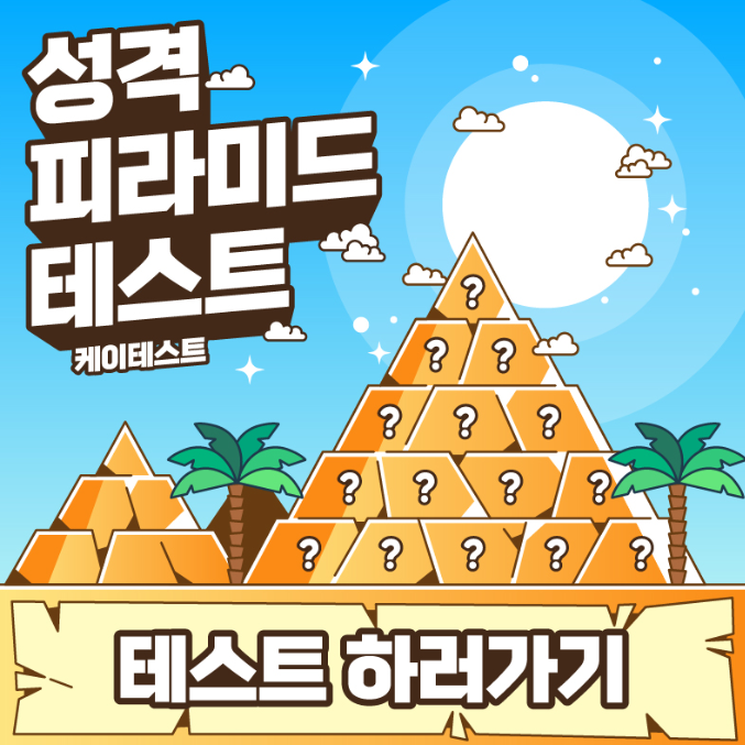 케이테스트의 종류로는 워낙 많아서 일일이 나열하기는 어렵지만 MBTI테스트, 연애, 성격, 재미, 사주, 운세 등이 있습니다. 오늘은 많은 종류 중의 하나인 피라미드에서 내 성격 발굴하기인 성격 피라미드 테스트를 해보려고 합니다.