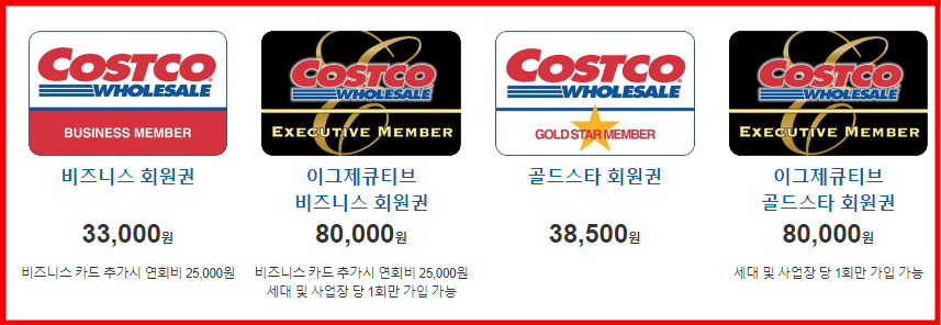 코스트코의 회원권은 비즈니스, 이그제큐티브 비즈니스, 골드스타, 이그제큐티브 골드스타 회원권이 있으며 이그제큐티브 회원권 2종만 구매금액의 2% 적립이 가능합니다.