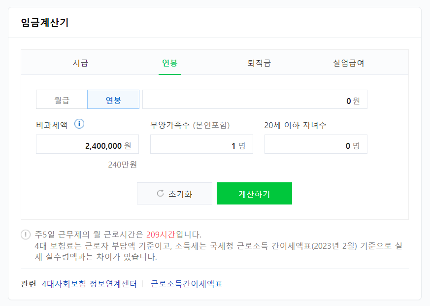 연봉계산기는 네이버에서 검색하시면 다음과 같은 창이 열립니다.