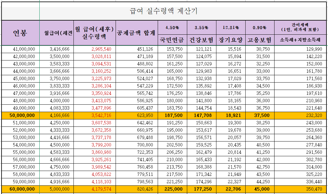 아래 첨부된 사진에서 자신의 연봉에 따라 적용되는 4대 보험(국민연금, 건강보험, 장기요양보험, 고용보험) 공제액과 구간별 소득세 및 지방소득세를 제외한 실수령액을 확인하실 수 있습니다.