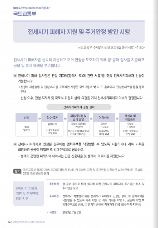 국토교통부 주택임차인보호과에서는 전세사기 피해자의 주거 안정 도모를 위해 경. 공매 절차의 신속한 지원 및 생계가 곤란한 피해자에 대한 긴급 신용대출 및 생계비, 의료비를 지원해 줍니다.