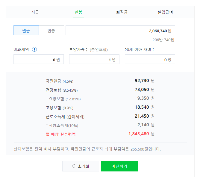 2024년 최저임금인 9,860원을 월로 환산하면 2,060,740원이며 4대 보험 및 근로소득세를 제외하면 실 수령액은 1,843,480원입니다.