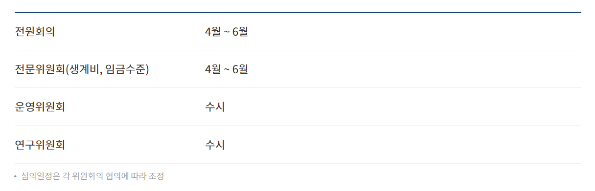 전원원회와 전문위원회의 심의일정은 매년 4월 ~6월이지만 협의에 따라 조정될 수 있으며 운영위원회 및 연구위원회는 기간의 정함이 없이 수시로 개최할 수 있습니다.