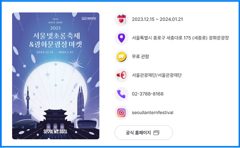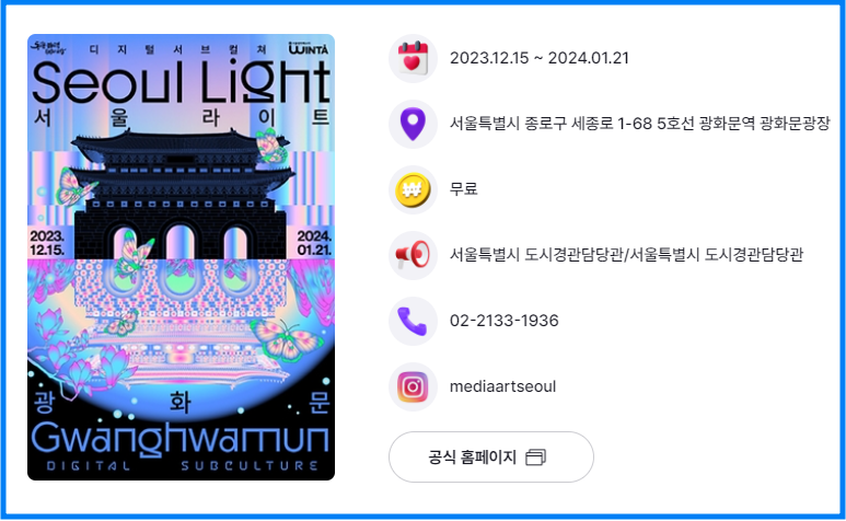 서울라이트 광화문 축제 기간은 24년 1월 21일까지이며 세부적인 내용은 아래의 공식 홈페이지에서 확인이 가능합니다.