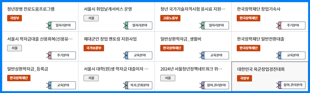 바로 신청이 가능한 청년지원정책은 국방부와 고용노동부, 한국장학재단, 국가보훈부, 서울시에서 지원하는 분야 등 다양한 청년지원을 바로 신청할 수 있으며 세부내용은 아래와 같습니다.