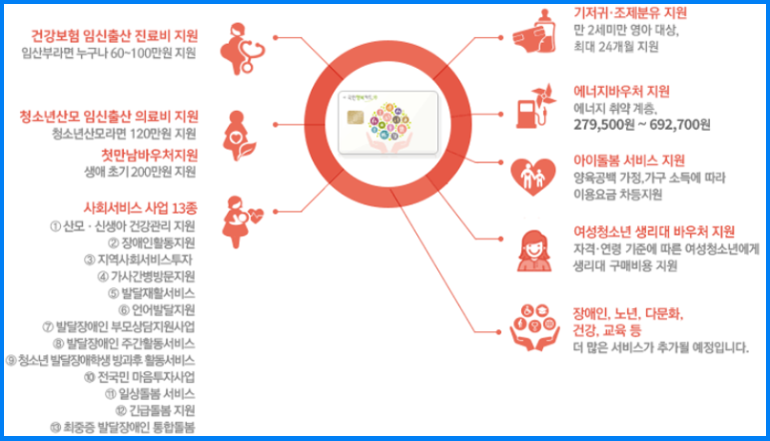 - 겨울 바우처: 전기, 도시가스, 지역난방 중 선택 차감 또는 실물 카드 결제 (10월~익년 5월 사용)
