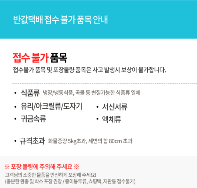 포장의 규격과 수거 거부 상품의 내용은 아래 첨부한 사진에서 확인하시기 바랍니다.