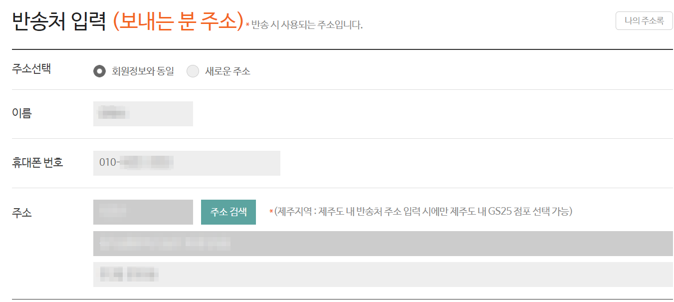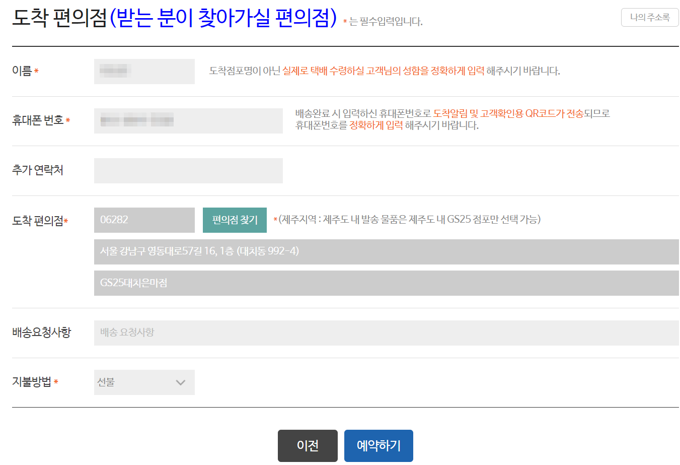받는 분이 택배를 수령하기 편한 가까운 GS편의점을 지정과 수령인의 인적사항을 기재하시면 택배 예약이 완료됩니다.