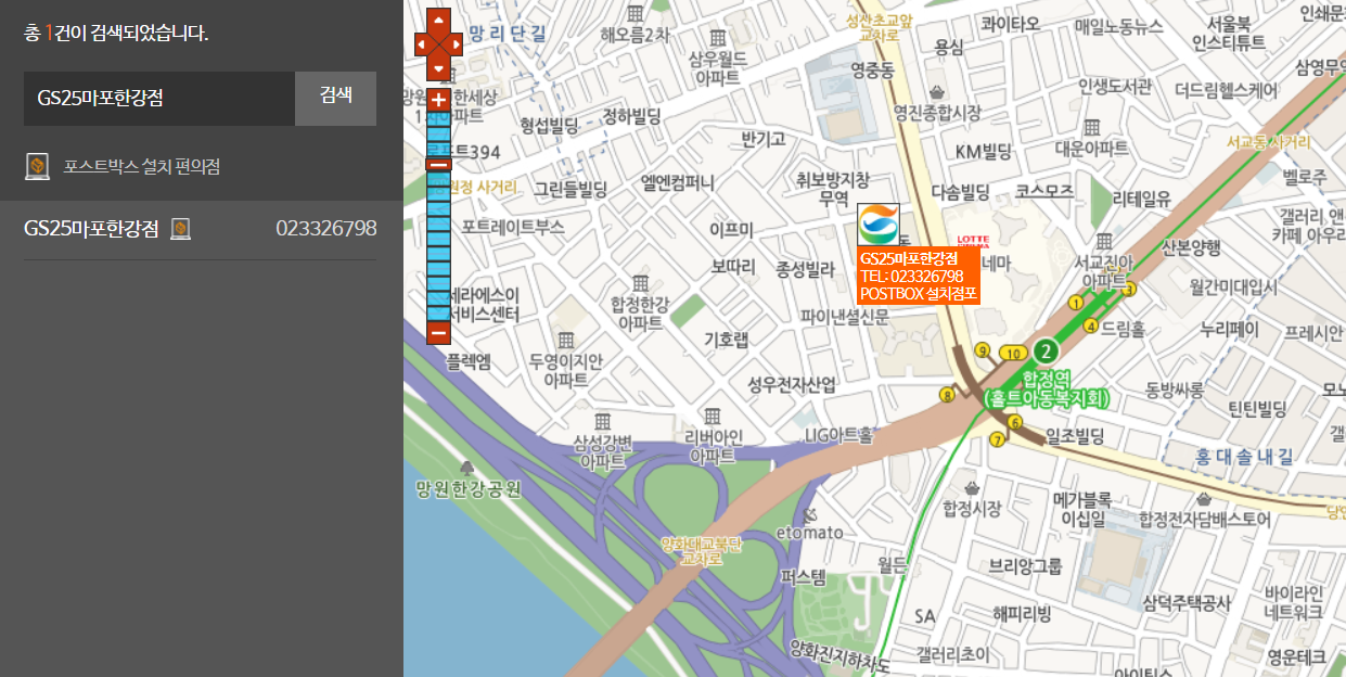 택배를 보내기 위한 내 주변의 POSTBOX가 설치된 GS편의점을 임의로 검색해 보니 합정역 인근에 마포한강점으로 검색이 됩니다. 주변의 가까운 POSTBOX가 설치된 GS편의점의 검색을 위한 링크를 올려드리니 택배 발송 시 참고하시기 바랍니다.