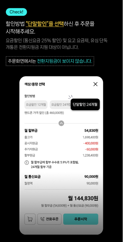 ① 단말할인을 선택하신 후 주문을 시작합니다.
